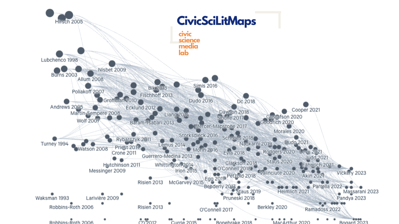 The Civic Science Literature Maps (CivicSciLitMaps) aims to help researchers and practitioners navigate the connections between the fast-growing literature on informal STEM learning, science communication, science outreach, science engagement, science policy, participatory science, and other forms of civic science by tracking the network of citations. You can access our growing library below and the citation map we are developing.
