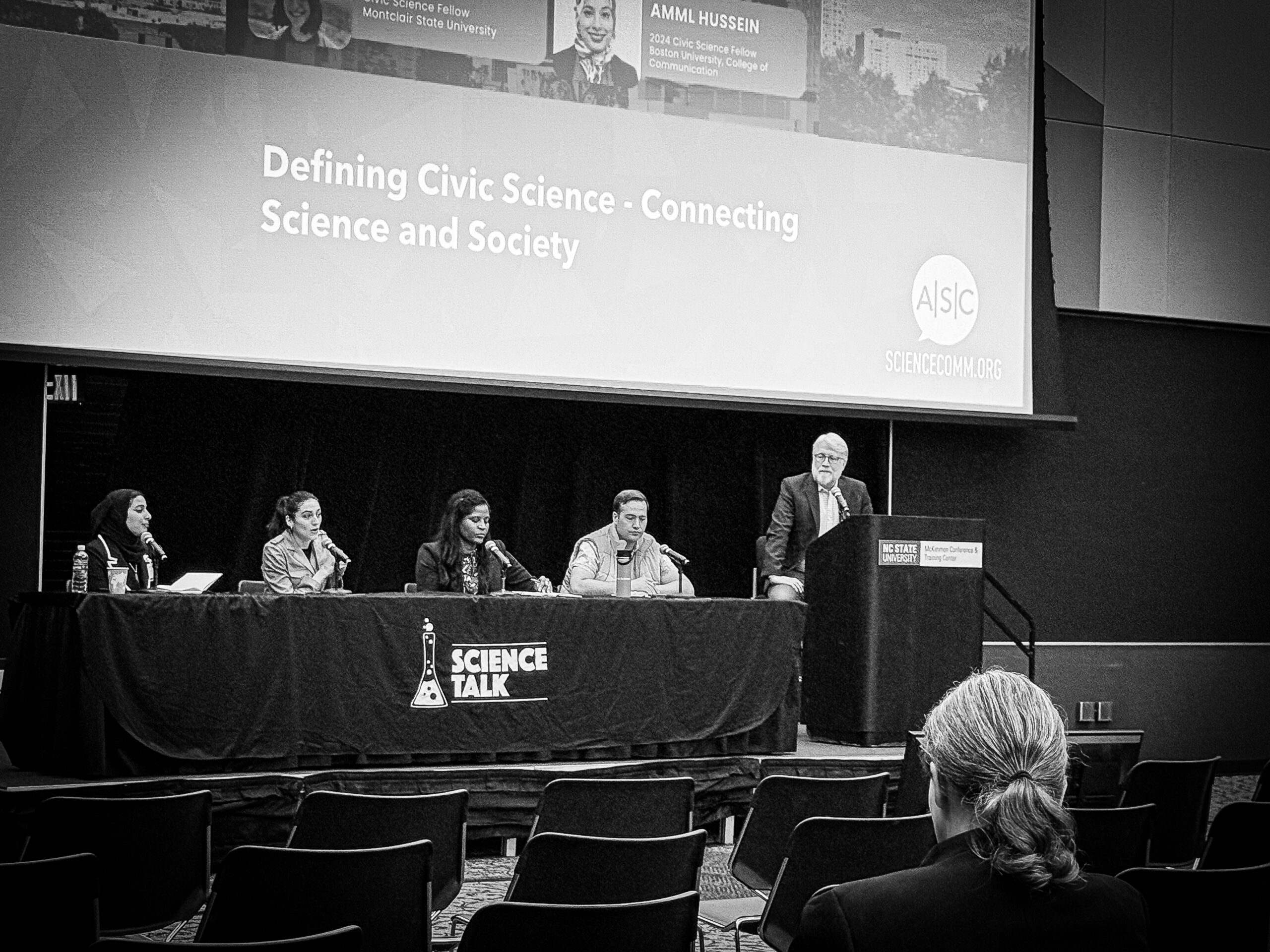 Catherine Devine (second from left) answers a question as a panelist during the annual Science Talk Conference at the McKimmon Center at North Carolina State University in Raleigh, NC. Titled “Defining Civic Science: Connecting Science and Society,” the panel aimed to “examine the concept of civic science in light of urgent science communication challenges.” In the audience were science communication practitioners and scholars. The panel was moderated by Brian Southwell (right). Other panelists: Amml Hussein (left), Jylana Sheats (third from left), and Andrew Makohon-George (second from right). Photo date: Apr 4, 2025.