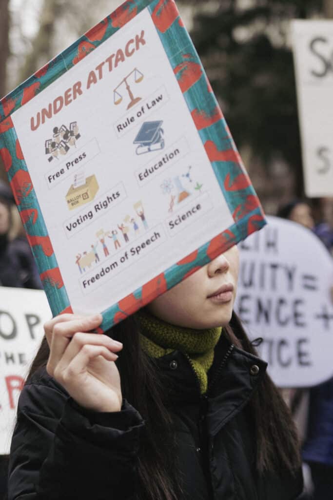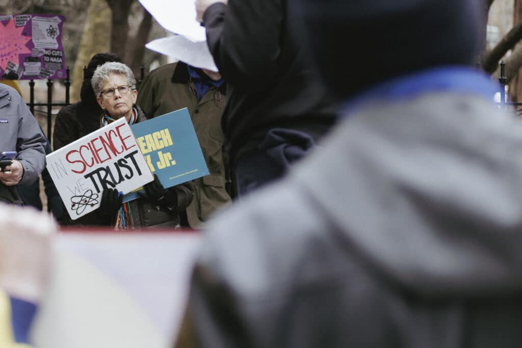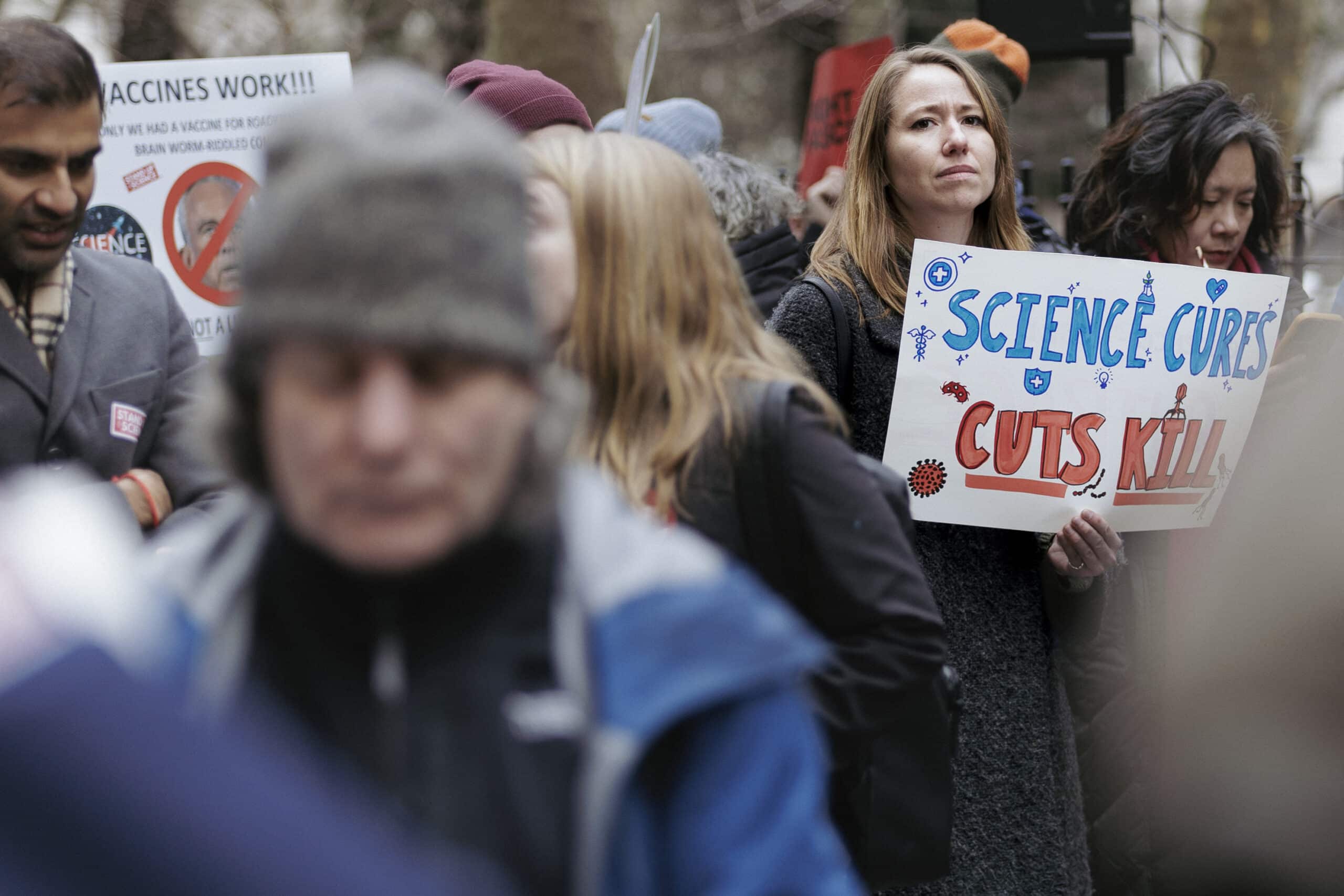 Rally attendee holds a sign that reads science cures, cuts kill. CSML Images//Kenna Beban//March 7, 2026.