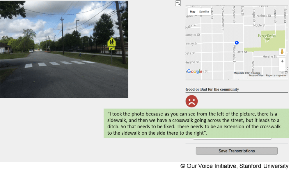 Abby King Well, I think it has to start with a coordinator or a community organization that is committed to doing it, so you can have communities around the world who would love to use Our Voice, but you really need boots on the ground. It could be one person or a community organization to kick it off, because there has to be some energy, there has to be local knowledge, and there has to be commitment to wanting to bring in residents and teach them how to do this. And again, it’s not very time-consuming, but still, it requires that kind of effort. So we make sure, before we start any Our Voice project, that there is a committed individual coordinator, community organization or research organization, or sometimes a governmental organization that is going to work with us across the Our Voice Project, period, and often these projects have very quick turnaround, so we’re talking a few months, and you can do an entire Our Voice project and get some nice change occurring at the end of that project. So I think that that’s a key ingredient, that’s part of the secret sauce of Our Voice where we really need that kind of commitment and energy in the community. As researchers, we’re not we don’t have the ability to be able to go into every community and make these things happen. So that has to come from the community. And. The thing I love about Our Voice that we’ve learned about a lot over the past 15 or so years is how flexible it is. We have the basic four steps involved, but there is so much adaptability and flexibility, and every community, every problem is different.
