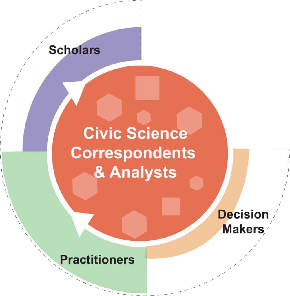 Our lab supports a core group of independent civic science correspondents and analysts who contribute to documenting and analyzing the rapidly developing landscape of civic science. Some conduct investigative reporting, others design tools, map ecosystems, or synthesize new research. The documentation generates insights that make civic science more visible, accessible, and actionable for those building initiatives to strengthen connections between the scientific enterprise and local communities.