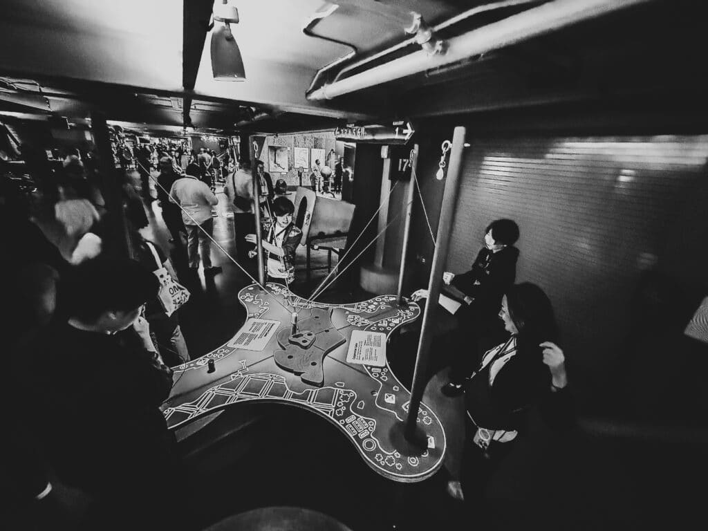 Visitors try out the “Cooperation Game” at the Exploratorium. (Unplug and Play, Sept 6, 2025; CSML Photo/Fanuel Muindi)